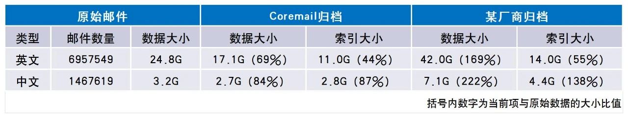 且經過測試發(fā)現,將相同的郵件數據導入歸檔系統(tǒng),Coremail郵件歸檔模塊通過CRC去重和分塊壓縮技術,有效降低了郵件數據占用空間。而導入某廠商歸檔產品后,存儲占用相比原始數據均進行了放大,整體占用甚至達到了Coremail歸檔的兩倍以上,很大程度上浪費了存儲空間,更進一步提高了其按容量結算的價格。