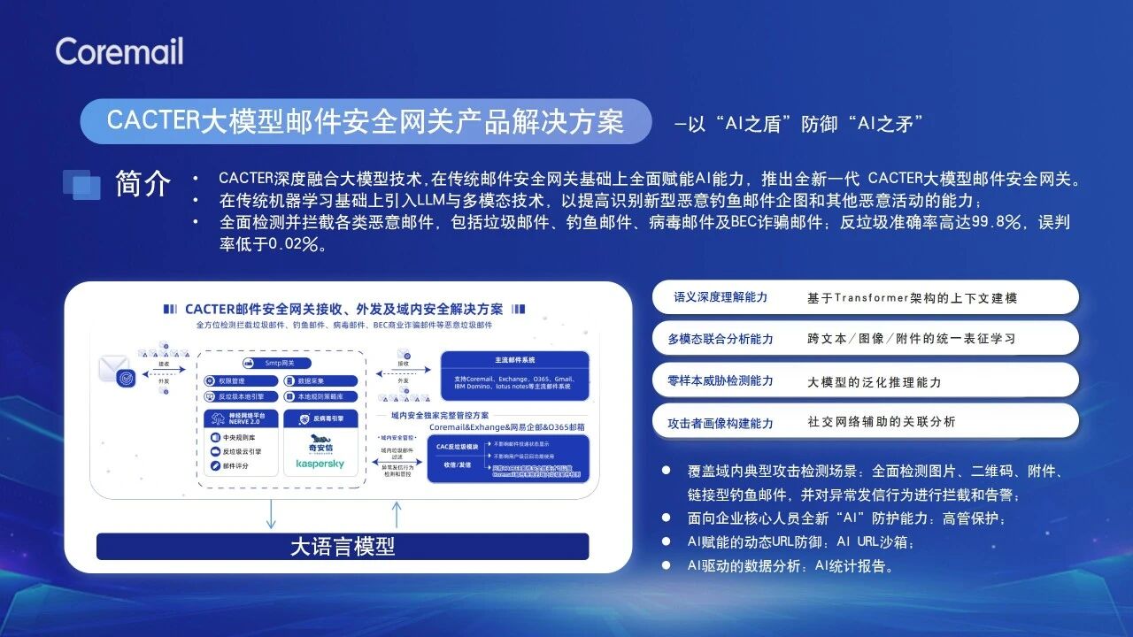 Coremail是全球領(lǐng)先的電子郵件系統(tǒng)與郵件安全服務(wù)提供商,26年來(lái)專注電子郵件安全及技術(shù)服務(wù),堅(jiān)持自主研發(fā),產(chǎn)品涵蓋郵件系統(tǒng)、企業(yè)郵箱、郵件歸檔系統(tǒng)、郵件投遞系統(tǒng)、郵件安全網(wǎng)關(guān)等,目前擁有超10億終端用戶。在AI技術(shù)席卷各行各業(yè)的當(dāng)下,Coremail亦在全面探索AI在郵件領(lǐng)域的智能體驗(yàn)和安全防護(hù)應(yīng)用。