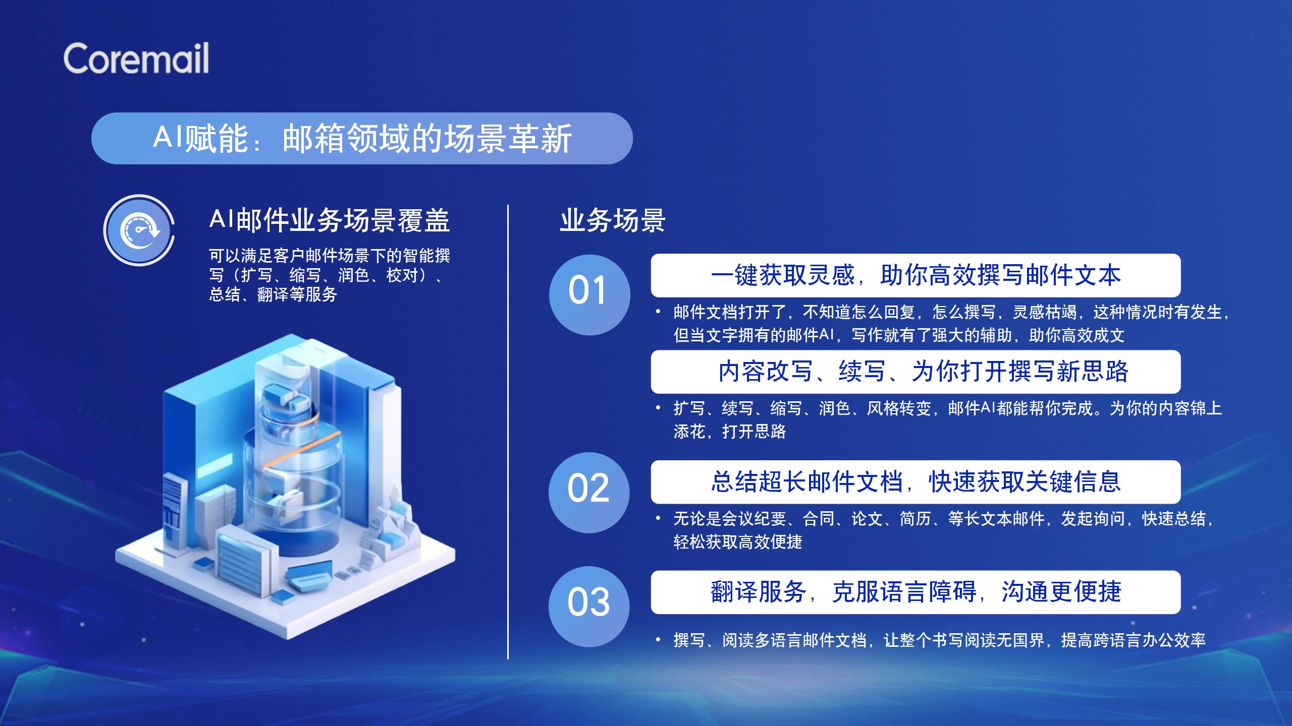 面對(duì)科技的新變化、新趨勢(shì),Coremail將AI能力與郵箱有機(jī)融合,通過(guò)Coremail大模型中間件整合數(shù)據(jù)資源,賦能郵箱,實(shí)現(xiàn)智能化和自動(dòng)化,落地功能涵蓋智能撰寫(xiě)、文章潤(rùn)色、智能校對(duì)、郵件翻譯、智能總結(jié)等多個(gè)郵件辦公場(chǎng)景,全面提升郵件辦公效率。