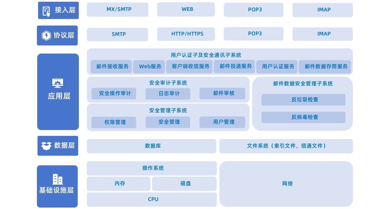 Coremail郵件系統(tǒng)歷時(shí)26年,把不同的功能模塊化,最大程度地減少系統(tǒng)的數(shù)據(jù)冗余,增強(qiáng)系統(tǒng)的穩(wěn)定性和運(yùn)作性。系統(tǒng)采用分布式部署架構(gòu),最大地避免系統(tǒng)宕機(jī),同時(shí)系統(tǒng)可保持高拓展性。