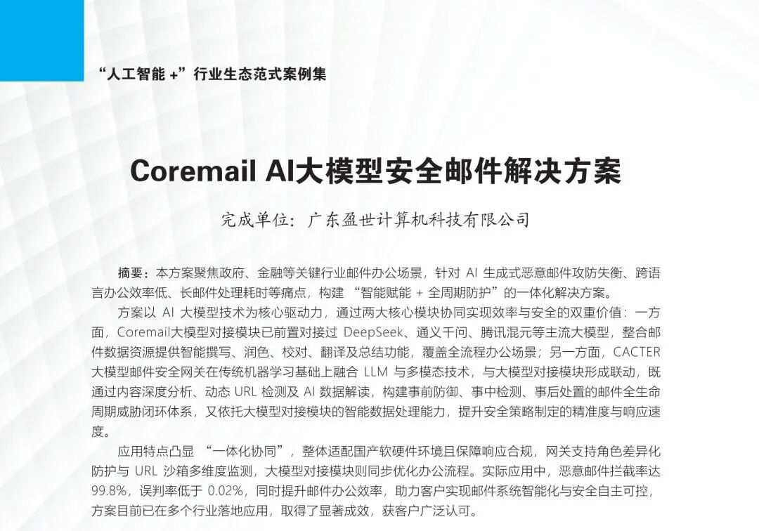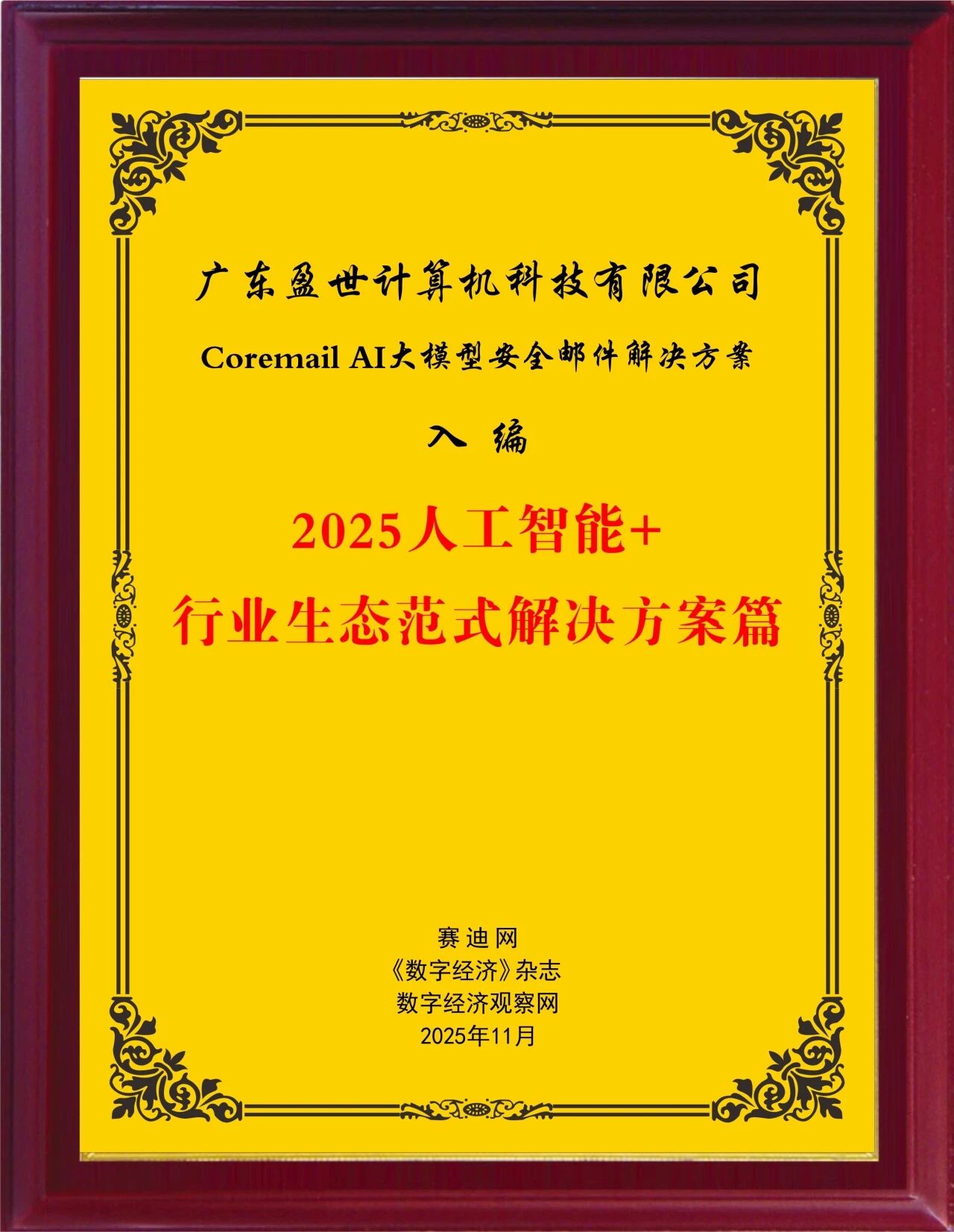 此前,《Coremail Al大模型安全郵件解決方案》入選賽迪網(wǎng)、《數(shù)字經(jīng)濟(jì)》雜志及數(shù)字經(jīng)濟(jì)觀察網(wǎng)共同發(fā)起的“2025人工智能+行業(yè)生態(tài)范式方案篇”。