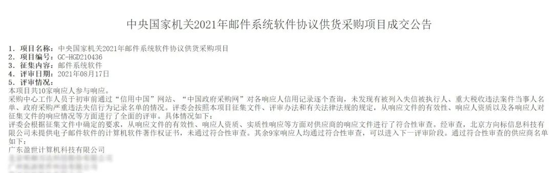 近日,《中央國(guó)家機(jī)關(guān)2021年郵件系統(tǒng)軟件協(xié)議供貨采購(gòu)項(xiàng)目成交公告》發(fā)布,Coremail郵件系統(tǒng)成功中標(biāo),再次入選!