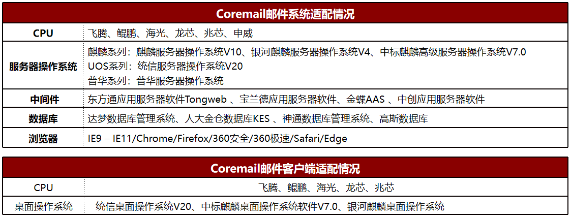 信創(chuàng)時(shí)代,Coremail廣泛適配主流信創(chuàng)產(chǎn)品,助力生態(tài)繁榮。目前,六種CPU、兩大國產(chǎn)體系(鯤鵬體系、PK體系)、四大中間件、兩大數(shù)據(jù)庫都已完成適配??蛻艨梢愿鶕?jù)自身需求情況進(jìn)行選擇。