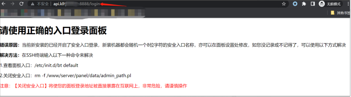 對此域名進行端口掃描,發(fā)現(xiàn)開啟8888端口,訪問該端口為發(fā)現(xiàn)寶塔登錄面板,由此可得出此釣魚為寶塔統(tǒng)一部署,從正面滲透進入寶塔難度極高。