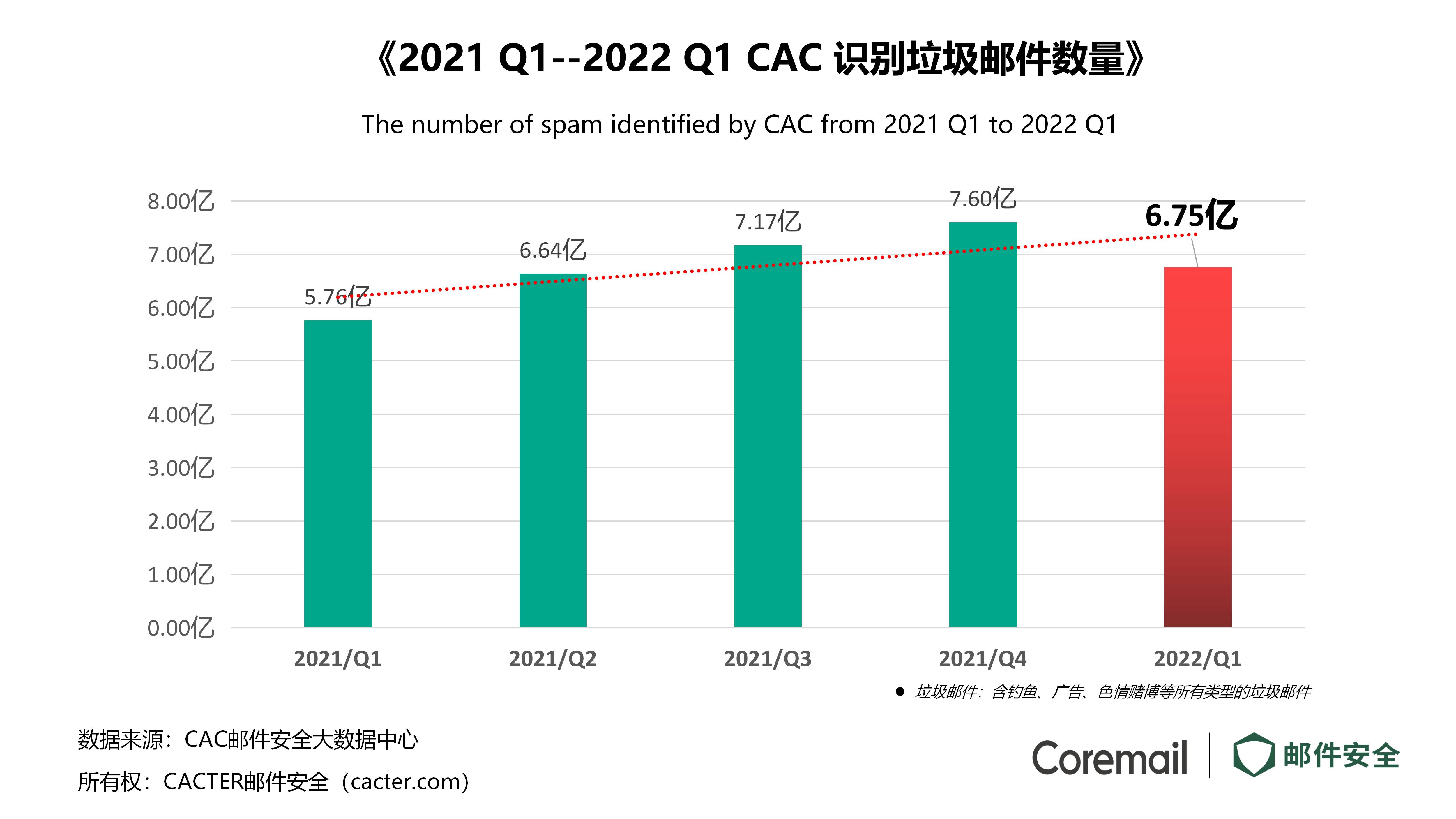 根據(jù)CAC大數(shù)據(jù)中心評(píng)估,2022 Q1季度全國(guó)企業(yè)郵箱用戶共收到各類垃圾郵件6.75億封,同比增長(zhǎng)17.28%。
