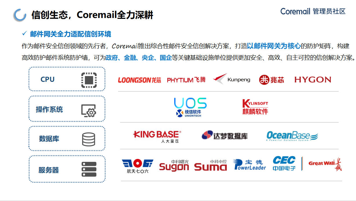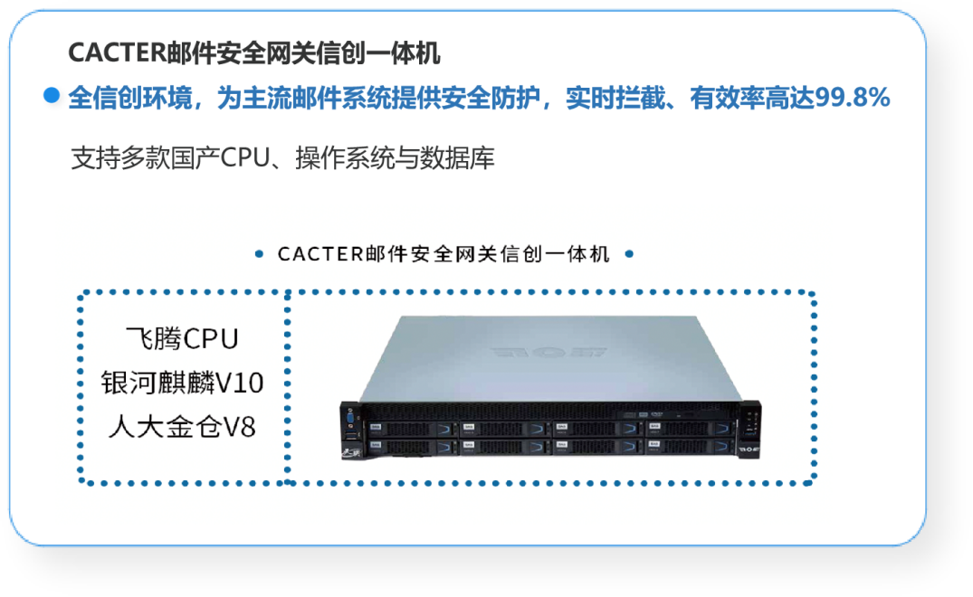 基于國產化CPU底座,CACTER郵件安全網關能夠兼容主流的國產操作系統(tǒng)、數據庫等信創(chuàng)生態(tài)的軟硬件產品,并可結合金融行業(yè)在郵件安全應用場景,防護方案,賦能教育、金融、政府、IT互聯(lián)網、央企國企及大型民營企業(yè)等。