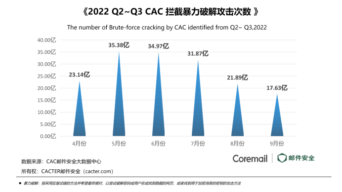 根據(jù)CAC郵件安全大數(shù)據(jù)中心監(jiān)測,對比Q2Coremail攔截93億4885萬次暴力破解攻擊,Coremail Q3共攔截了71億3924萬暴力破解攻擊,降幅達到23.6%。