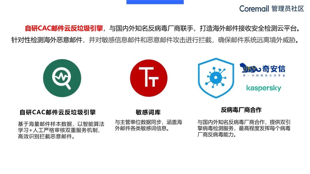 Coremail安全海外中繼內(nèi)嵌反垃圾、反釣魚、反病毒,防偽造,敏感過濾等安全能力,支持云端隔離區(qū),云端反垃圾能力可防護(hù)僵尸網(wǎng)絡(luò)等對(duì)境內(nèi)郵件系統(tǒng)的沖擊,保證國內(nèi)師生免受境外惡意郵件侵?jǐn)_,提高學(xué)術(shù)機(jī)密信息安全系數(shù)。