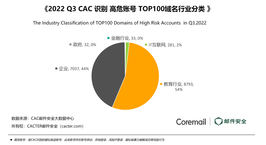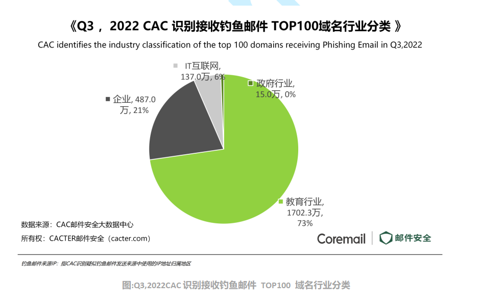據(jù)Coremail郵件安全大數(shù)據(jù)中心分析,2022,Q3 TOP 100 域名中,無論是接收釣魚郵件數(shù)量、接收垃圾郵件數(shù)量、被暴力破解攻擊次數(shù),均為教育行業(yè)遭受的威脅最大。