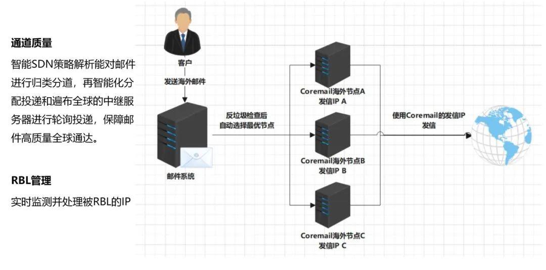 Coremail安全海外中繼的智能SDN策略解析能對(duì)郵件進(jìn)行歸類分道,再智能化分配投遞和遍布全球的中繼服務(wù)器進(jìn)行輪詢投遞,保障郵件高質(zhì)量全球通達(dá),同時(shí)安全海外中繼能實(shí)施監(jiān)測(cè)并處理RBL的IP,通過以上多種手段,保證高校郵件國外投遞業(yè)務(wù)穩(wěn)定、連續(xù)。
