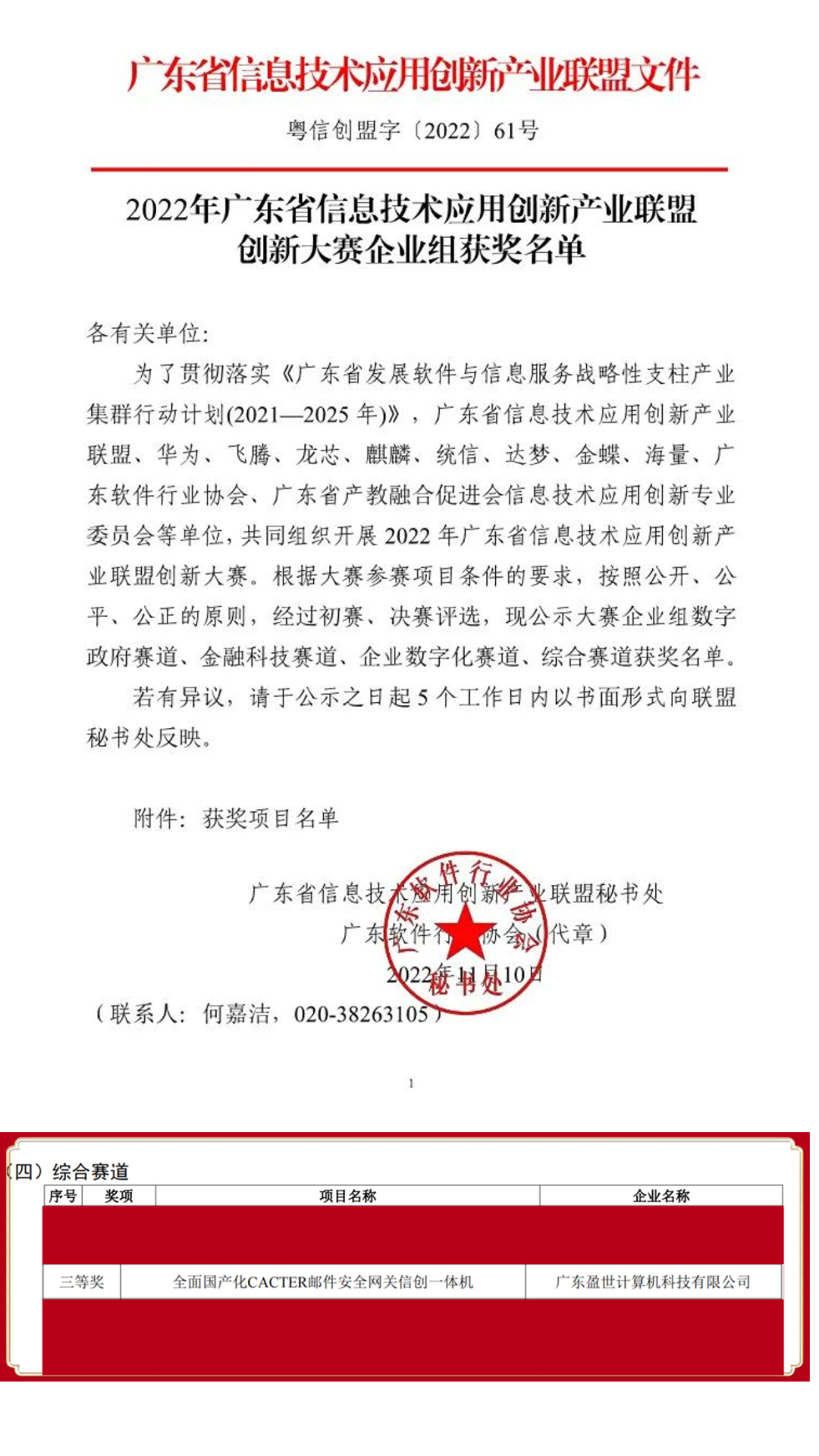 廣東盈世計算機科技有限公司申報的方案《全面國產(chǎn)化CACTER郵件安全網(wǎng)關(guān)信創(chuàng)一體機》榮獲企業(yè)組綜合賽道三等獎,該方案目前已涵蓋銀行、證券保險、基金等領(lǐng)域,服務多家中大型金融客戶。