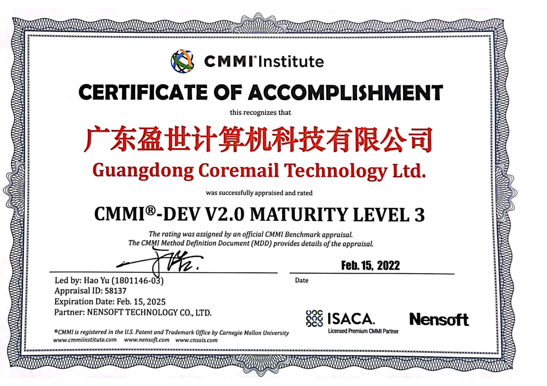 2022年2月,廣東盈世計算機科技有限公司被授予CMMI 3級證書。CMMI全稱為Capability Maturity Model Integration,即軟件能力成熟度模型集成,是國際公認的衡量軟件企業(yè)業(yè)務能力成熟度和項目管理水平的權(quán)威標準,主要用于指導軟件開發(fā)過程的改進和進行軟件開發(fā)能力的評估,是目前全球范圍內(nèi)軟件領(lǐng)域難度最大、規(guī)格最高、最權(quán)威的認證之一。