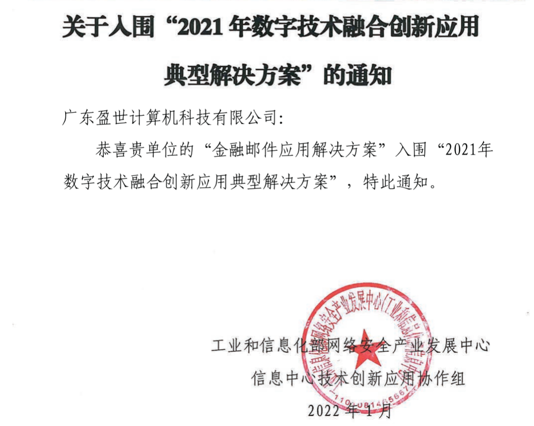 2022年1月,Coremail金融郵件應用解決方案成功入圍由工業(yè)和信息化部網(wǎng)絡安全產(chǎn)業(yè)發(fā)展中心(工業(yè)和信息化部信息中心)、信息中心技術(shù)創(chuàng)新應用協(xié)作組主辦的“2021年數(shù)字技術(shù)融合創(chuàng)新應用典型解決方案”