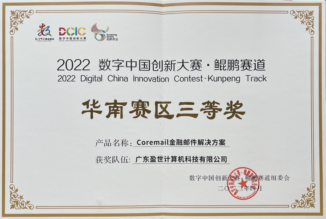 7月15日下午,2022數(shù)字中國創(chuàng)新大賽·鯤鵬賽道華南賽區(qū)頒獎典禮順利舉行,廣東盈世從眾多隊伍中脫穎而出,憑借著Coremail金融郵件解決方案自主可控的技術(shù)實踐和開放靈活的系統(tǒng)應用榮獲華南賽區(qū)三等獎。