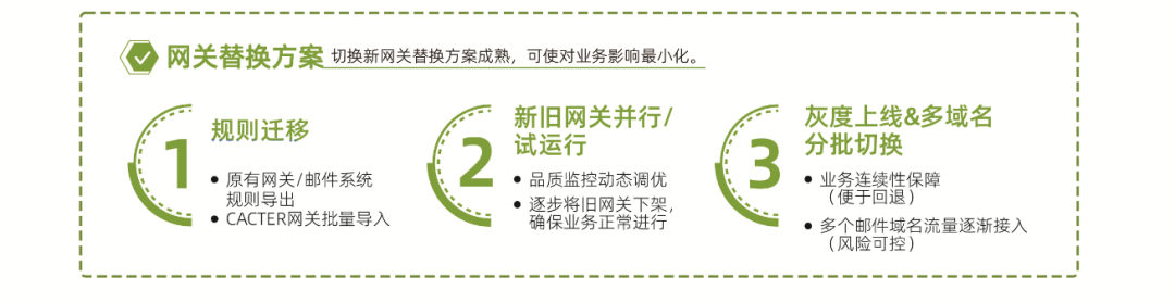在啟動(dòng)替換計(jì)劃時(shí),如何快速無感知平滑替換、為現(xiàn)有郵件系統(tǒng)提供安全防護(hù)是重中之重。