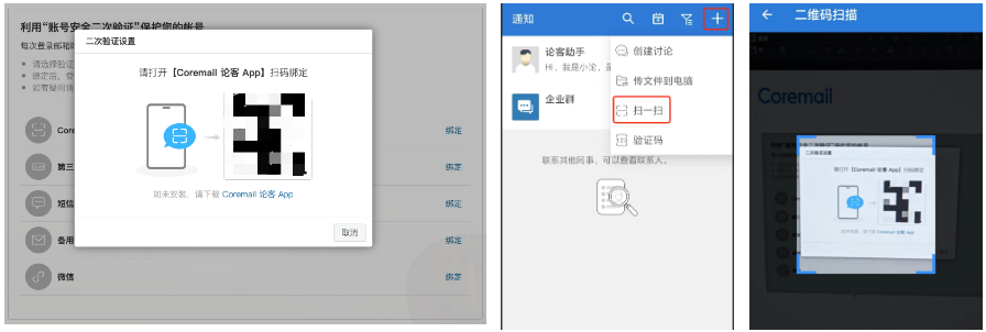 2)在webmail或Coremail郵箱客戶端軟件 V4.0及以上版本的二次驗(yàn)證綁定頁,用App掃描二維碼即可完成綁定。