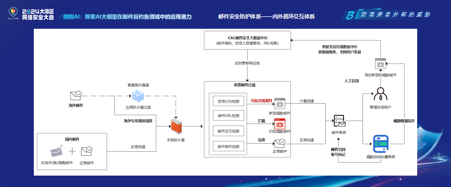 11月8日,網(wǎng)絡(luò)與數(shù)據(jù)安全分論壇開(kāi)講,Coremail高級(jí)安全解決方案專(zhuān)家劉騫發(fā)表“擁抱AI:探索AI大模型在郵件反釣魚(yú)領(lǐng)域中的應(yīng)用潛力”主題演講,分享了Coremail在AI大模型融合郵件防護(hù)應(yīng)用的探索。